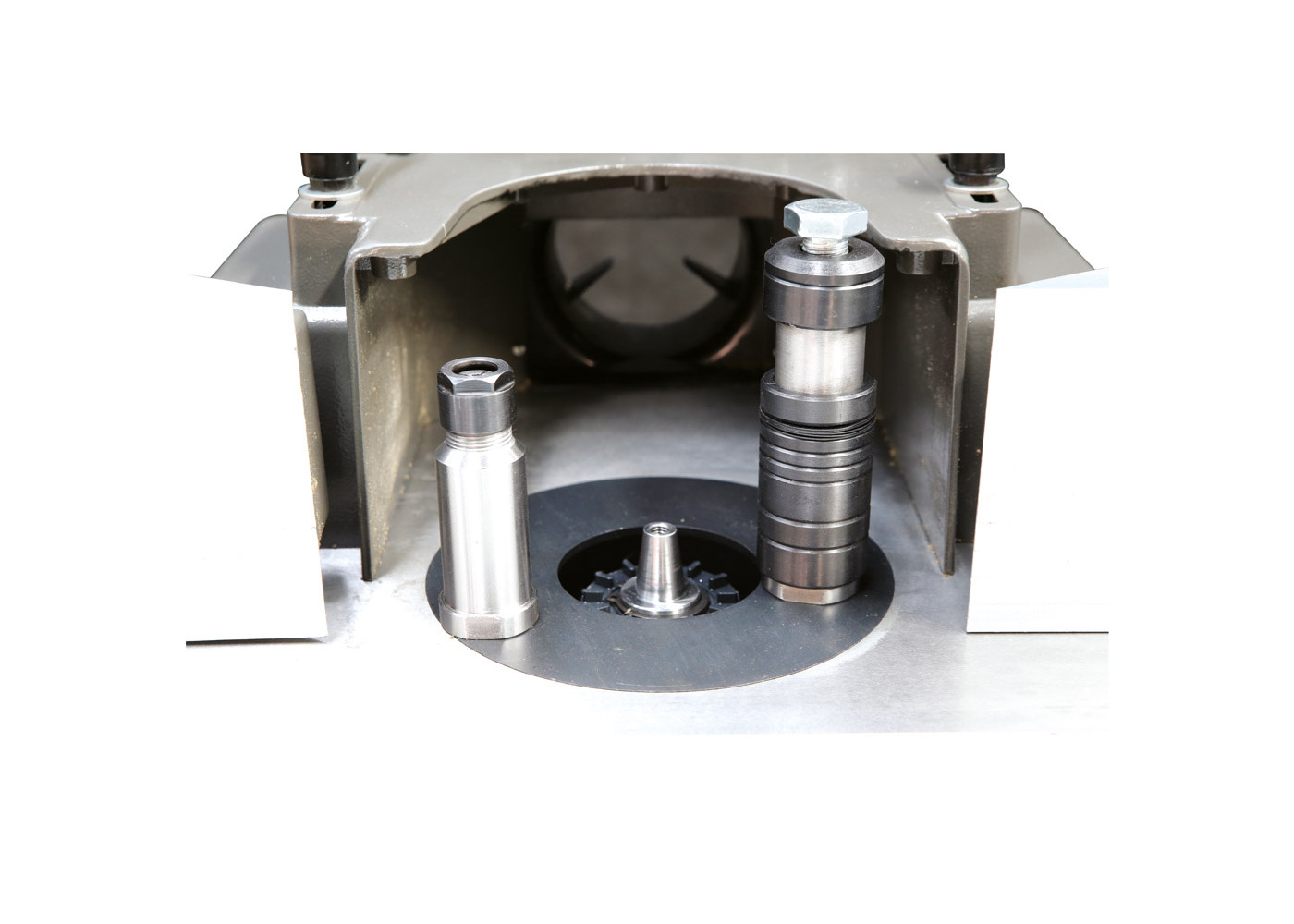 Equipada con guías aluminio, toma aspiración, carro espigar aluminio, inversor de giro, cuatro velocidades. Permite trabajar con fresolins de mango de 8 y 12 mm y fresas o cabezales de eje 30 mm.